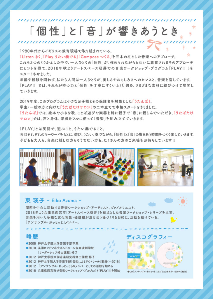 2019年度前期のワークショップ・プロジェクトのチラシを方々に送っているのですが、先日とある届け先の方からとてもカラフルなチラシだと褒めていただきました(わーい♫)。