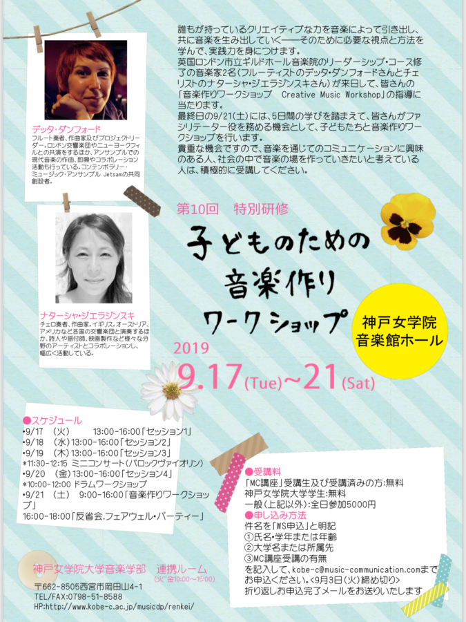 今回の記事は、兵庫県西宮市の神戸女学院大学音楽学部で今秋開かれる予定の、音楽ワークショップ・プログラムのご案内です。 今年9月17日(火)から21日(土)まで、神戸女学院大学音楽学部内にて、音楽づくりワークショップ特別研修が開催されます。※外部から一般の方も参加可能です。 このワークショップ・プ...