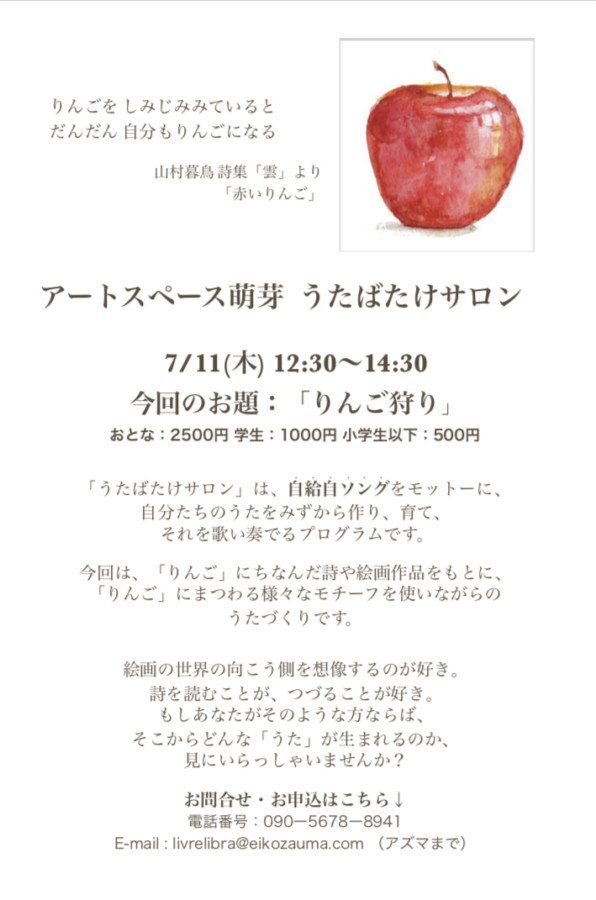 7月11日(木)の音楽ワークショップ・プログラムが近づいてきました。 第一部・親子向けワークショップ「うたんぼ」、第二部・音楽づくりプログラム「うたばたけサロン」ともに、現在も参加者を募集中です。 現行のチラシ(ご参考に)では、それぞれのプログラム、特に第2部の音楽づくりのワークショップが具体的にどのような...